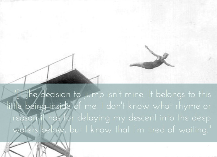 I am teetering on the edge. There is no turning back even if I wanted to. The only way out is down…Overlooking the water, I’m not sure I can manage the deep end below. It will involve treading water at a pace I’ve never accomplished before… But you know, it’s got to beat just standing here at the end of high dive with all eyes upon me.